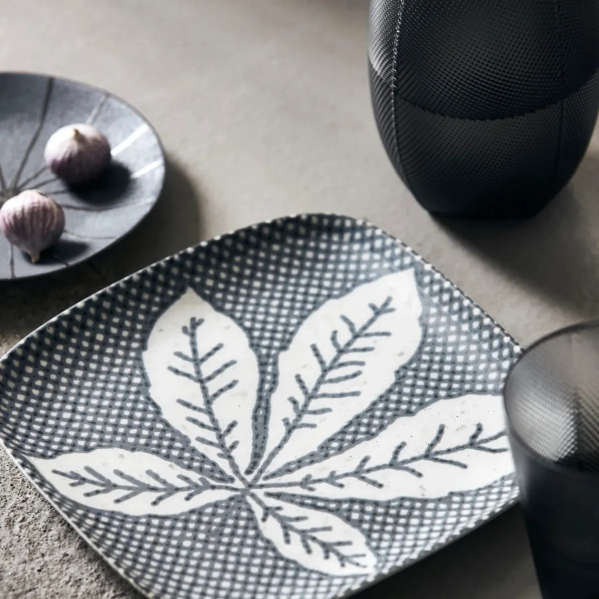 Keramikteller mit Blattmotiv. Die matten Grau- und Weißtöne passen gut zu den abgerundeten Ecken der quadratischen Form. Das Design des Chestnut-Tellers von House Doctor könnte Ihnen Retro-Vibes vermitteln. Aber das Geheimnis liegt darin, wie Sie es verwenden und womit. Kombinieren Sie es mit unseren anderen Blattmotiv-Tellern oder mischen Sie es mit Tellern aus anderen Materialien und gedeckten Farben für ein ganz persönliches Tischarrangement. Es ist sicherlich eine Möglichkeit, ein Gefühl für die Natur zu vermitteln