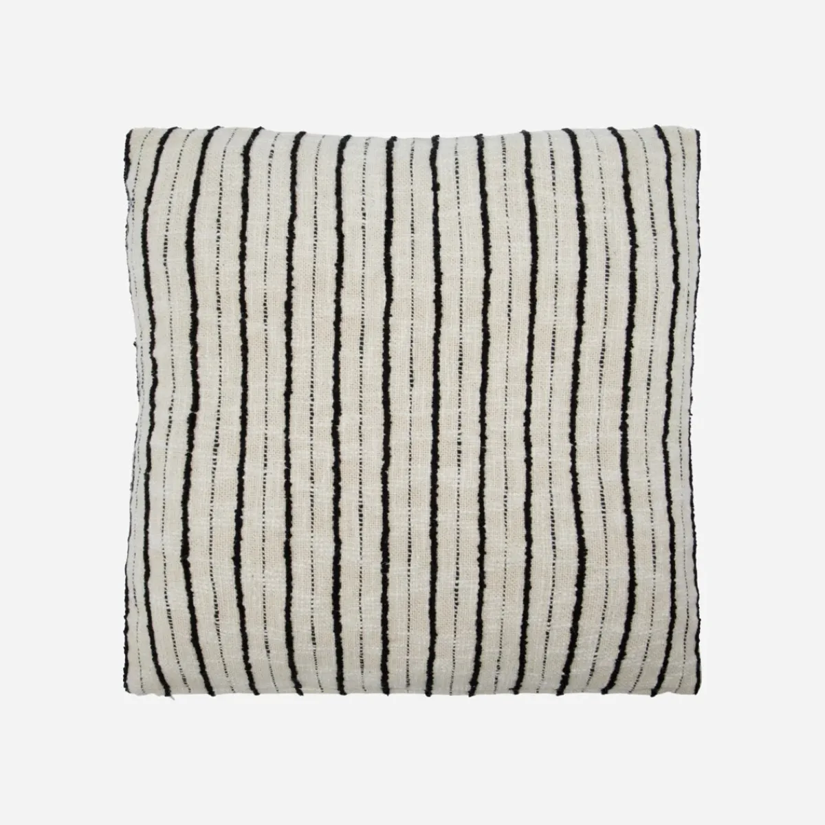 Feine schwarze Streifen auf weicher Baumwolle sorgen für einen zeitlosen Look, der sich vielseitig mit anderen Dekokissen kombinieren lässt. Die angenehme Textur und das dezente Muster schaffen einladende Gemütlichkeit – egal ob im Lesesessel, auf dem Bett oder als entspannter Akzent im Lounge–Bereich.– Handgewebtes Unikat.