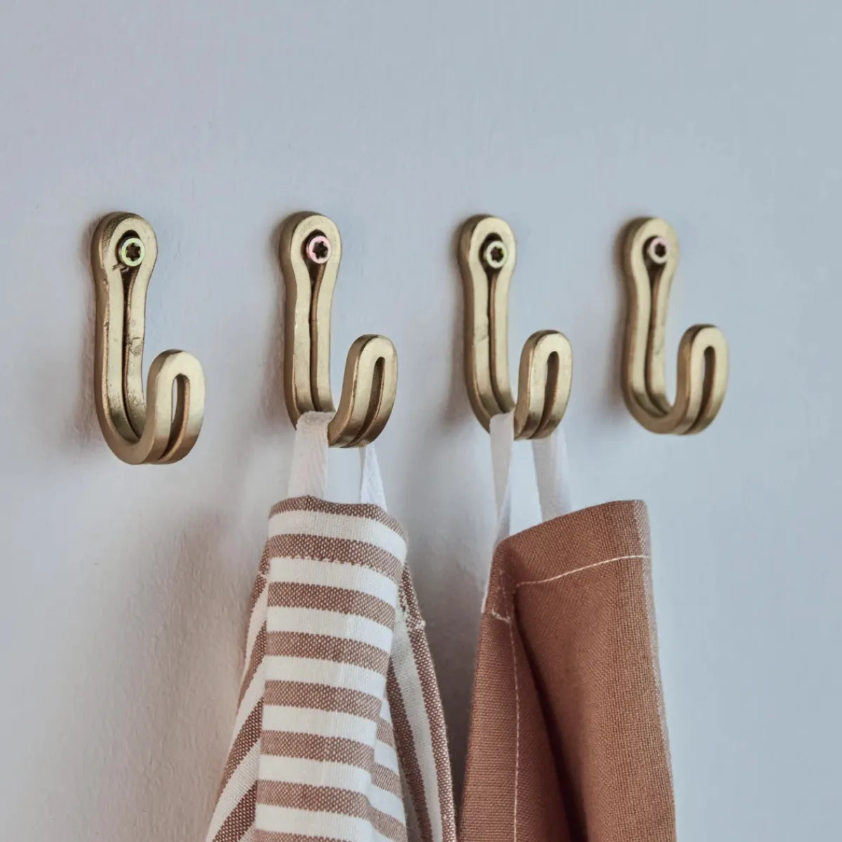 Rustic hooks, simple looks. This pack of 4 hooks from House Doctor is that little bit of detail you need to update your home and add practical storage. Made of iron with a brass finish, they complement any interior style, adding warmth, charm and elegance. Hang the hooks in your hallway, bedroom or bathroom. Wherever you need to organise your outerwear, bags and other accessories.