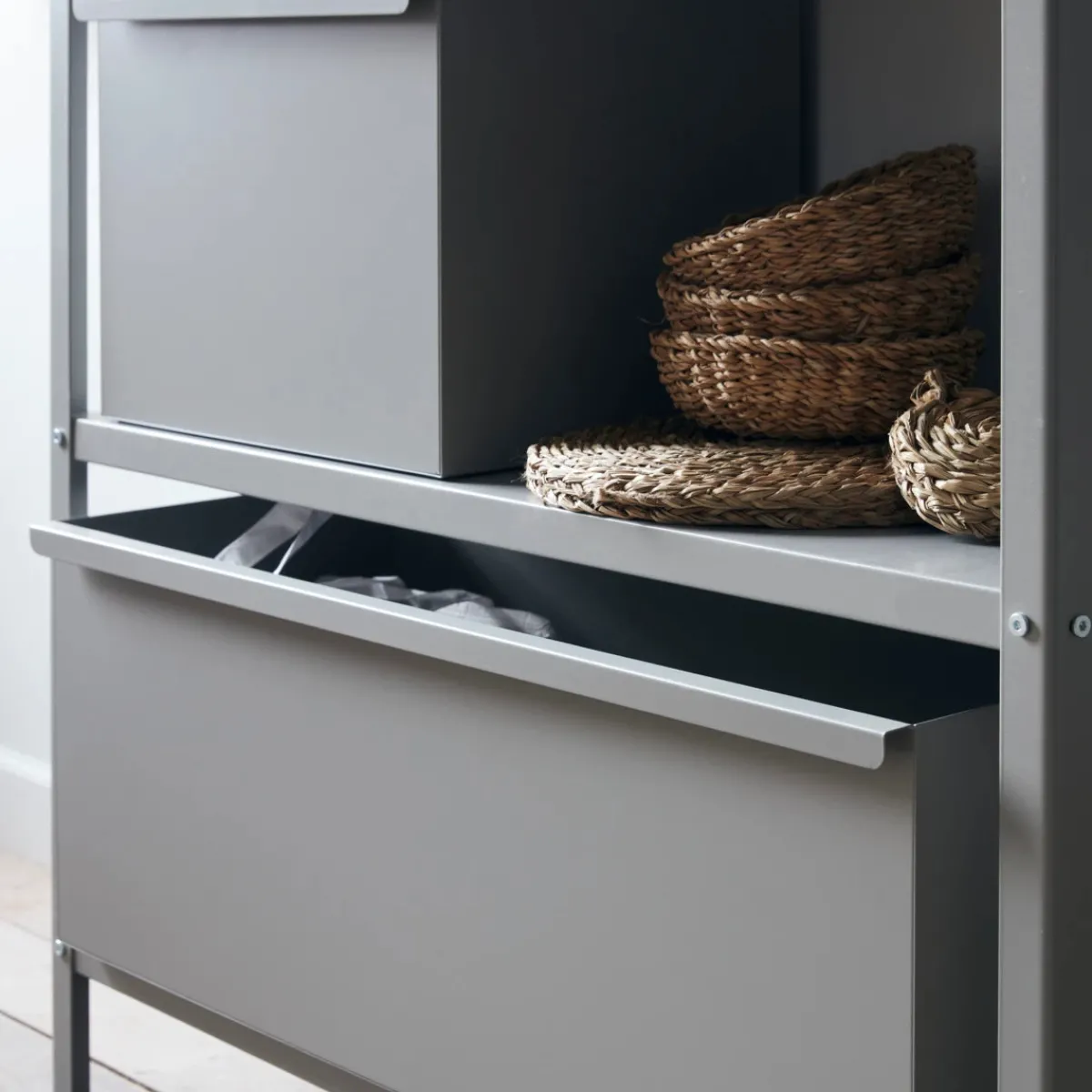 Bring order to your interior with this sophisticated storage unit, where clean lines and contemporary design create a seamless addition to your shelving system. The premium steel construction, enhanced by a refined grey finish, delivers both lasting durability and understated elegance for your organisational needs.